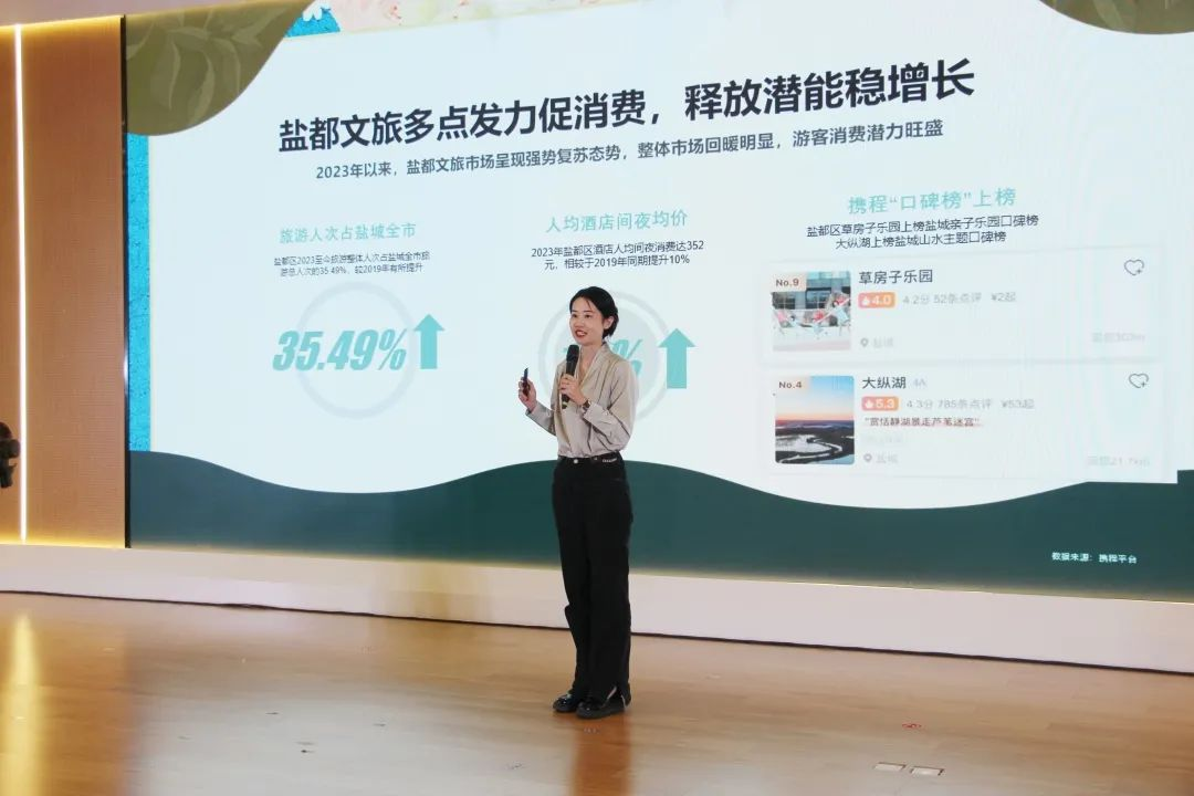 在推介會上,攜程集團政府合作部項目總監(jiān)王焱發(fā)布“鹽都文旅及攜程集團2023年戰(zhàn)略合作”重點內(nèi)容,深度剖析雙方未來合作的藍圖。她提到,2023年以來,鹽都文旅市場呈現(xiàn)強勢復(fù)蘇態(tài)勢,整體市場回暖明顯。攜程一直都是鹽城文旅發(fā)展道路上堅實的合作伙伴。去年雙方共同打造的“到鹽城·嗨周末”品牌獲評文旅部2022年旅游宣傳推廣優(yōu)秀案例。而今年,攜程將繼續(xù)深耕鹽城文旅,在全市文旅資源的加持之下,依托2023年攜程集團振興A計劃開拓區(qū)縣合作,與鹽都文旅建立戰(zhàn)略合作關(guān)系,協(xié)同并進共育花開。攜程集團將聚合站內(nèi)外流量資源,從產(chǎn)品、營銷、消費三大層面開足馬力驅(qū)動文旅建設(shè)加速度,“串珠成鏈”,多措并舉推動鹽都文旅造就高質(zhì)量發(fā)展格局。